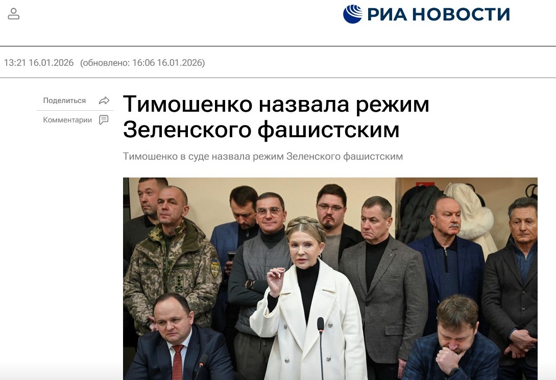 С аналогичным сообщением выступило 16 января и одно из ведущих российских пропагандистских СМИ - информагентство "РИА Новости", опубликовав информацию под заголовокм "Тимошенко назвала режим Зеленского фашистским".