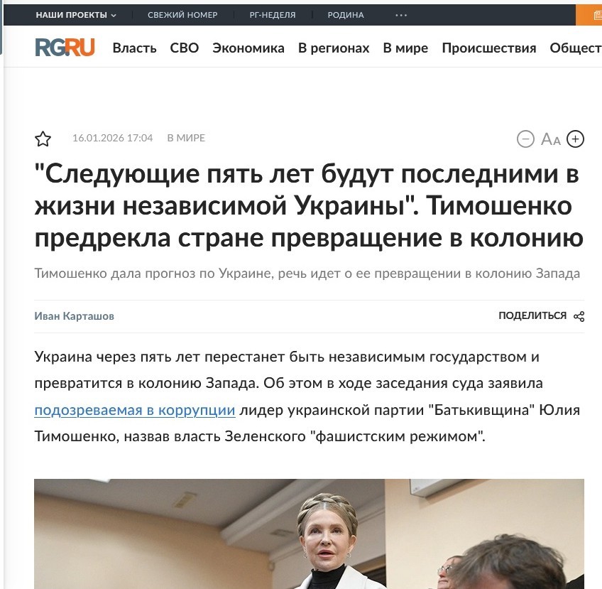 "Следующие пять лет будут последними в жизни независимой Украины". Тимошенко предрекла стране превращение в колонию", - информацию под таким заголовком опубликовал 16 января сайт "Российской газеты" - официального издания правительства России.