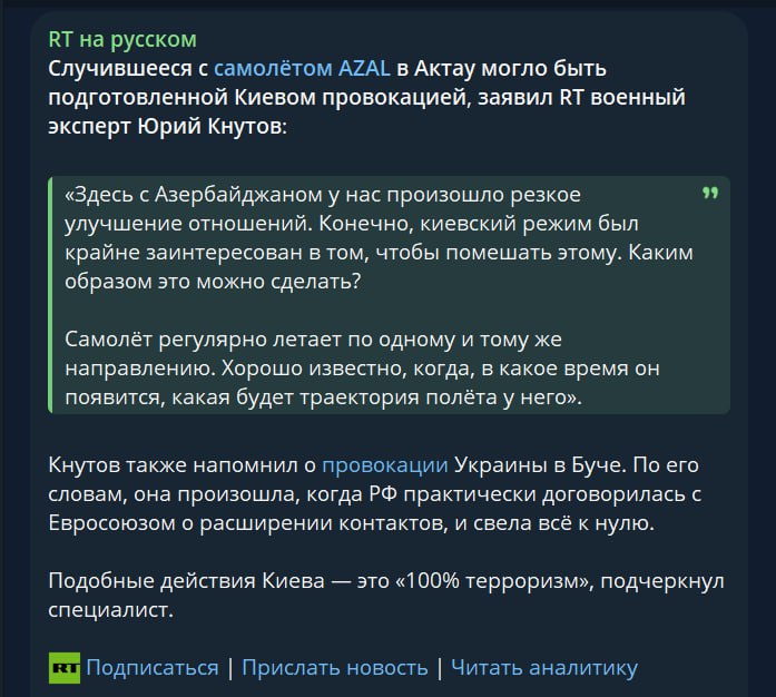 Бездоказательные обвинения в адрес Украины начали распространять федеральные СМИ. Так, в телеграм-канале RT появилась колонка директора Музея ПВО Юрия Кнутова, который назвал крушение самолета авиакомпании Azerbaijan Airline в Актау "подготовленной Киевом провокацией".