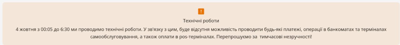 <p style="text-align: justify;">"В ночь на 4 октября 2025 года Приватбанк проводит плановые регламентные работы процессингового центра. В период проведения работ 4 октября с 00:05 до 6:30 утра банк временно приостановит проведение операций с картами. Аналогичный "тайм-аут" будет действовать в работе банкоматов, терминалов самообслуживания и POS-терминалов банка", - сообщили на <a href="https://privatbank.ua/news/2025/10/3/4-zhovtnya-reglamentni-roboti-procesingu-privatbanku-oplati-kartkami-budut-na-pauzi-z-opivnochi-do-6-30-ranku" target="_blank" rel="noopener">сайте</a> Приватбанка 3 октября.</p> <p style="text-align: justify;">Соответствующие сообщения получили клиенты банка.</p> <div class="article__content__img"><img class="" title="" src="/upload/media/2025/10/03/photo-2025-10-03-21-08-59.jpg" alt="" /></div> <p style="text-align: justify;">"Обычно регламентные работы мы проводим в ночное время, когда большинство клиентов не проводят операций. Если в период проведения работ вы планируете оплату картами - советуем сделать это заранее или отложить на несколько часов", - говорится в сообщении на сайте.</p> <p style="text-align: justify;">Ранее сообщалось, что <a href="/news/pryvatbank-pryzupynyt-operatsiyi-z-platizhnymy-kartkamy-ta-platezhi-kliyentiv-u-pryvat24-z-i495417" target="_blank" rel="noopener">Приватбанк приостанавливал операции с платежными картами и платежи клиентов в Приват24 с полуночи до утра 20 октября прошлого года.</a></p>