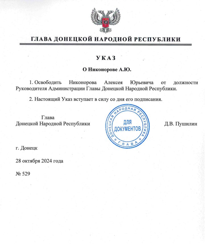 Главарь "ДНР" Денис Пушилин освободил от занимаемой должности "руководителя администрации главы ДНР" Алексея Никонорова. Соответствующий "указ" подписан 28 октября.