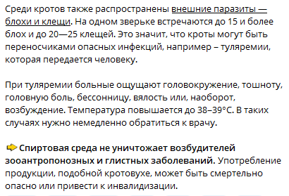 "Роспотребнадзор" предостерегает россиян от употребления спиртовой настойки на тушке мертвого крота. Подробное объяснение, почему не стоит пить "кротовуху" был размещено на официальной странице надзорного ведомства в Телеграм.