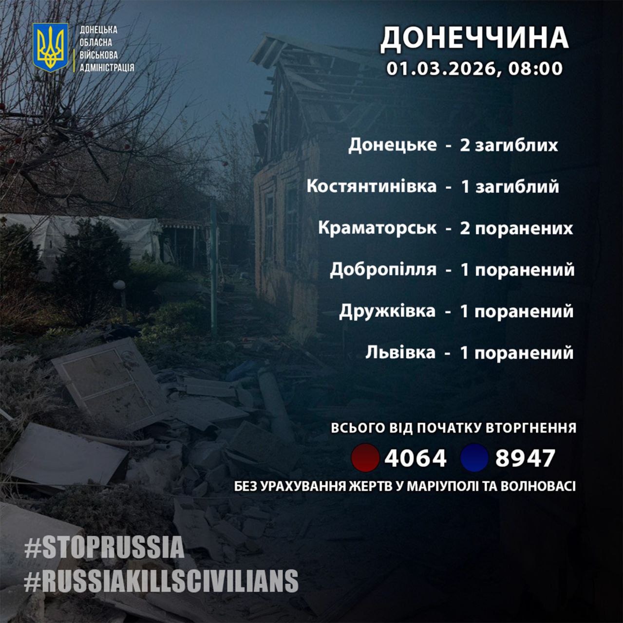 "За 28 февраля россия нанесла 1513 ударов по линии фронта и жилому сектору области. Под огнем находились 10 населенных пунктов: города Доброполье, Дружковка, Константиновка, Краматорск, Николаевка, Славянск, поселки Донецкое, Райгородок, Сухановка, село Львовка. Разрушения подверглись 79 гражданских объектов, из них 60 жилых домов", - сообщает 1 марта в Телеграм полиция Донетчины.