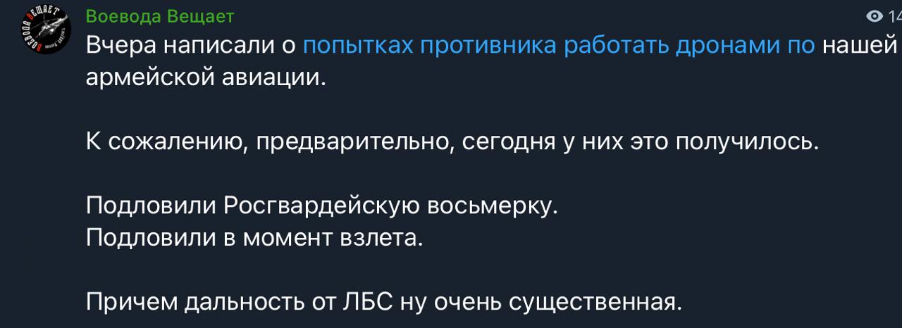Блогер Алексей Воевода утверждает, что Вооружённые силы Украины сбили российский вертолёт Ми-8, когда он только поднимался в воздух. «Причем дальность от ЛБС ну очень существенная», — подчеркнул Воевода.