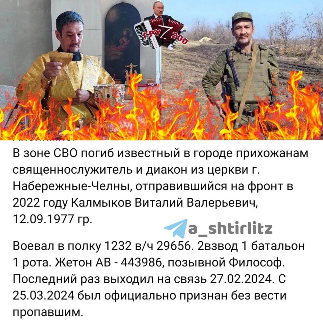 Священник РПЦ из города Набережные Челны Виталий Калмыков, который отправился воевать в Украину в 2022 году, признан в РФ официально пропавшим без вести. Об этом сообщает полковник ВСУ Анатолий Штефан 17 мая.