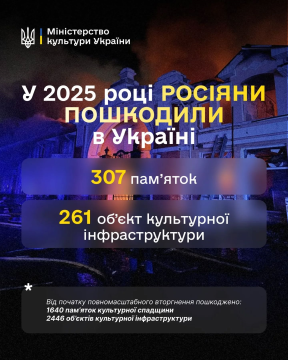 «В 2025 году в результате российской агрессии в Украине было разрушено и повреждено 307 памятников культурного наследия и 261 объект культурной инфраструктуры», — сообщает Донецкая ОВА 7 января.