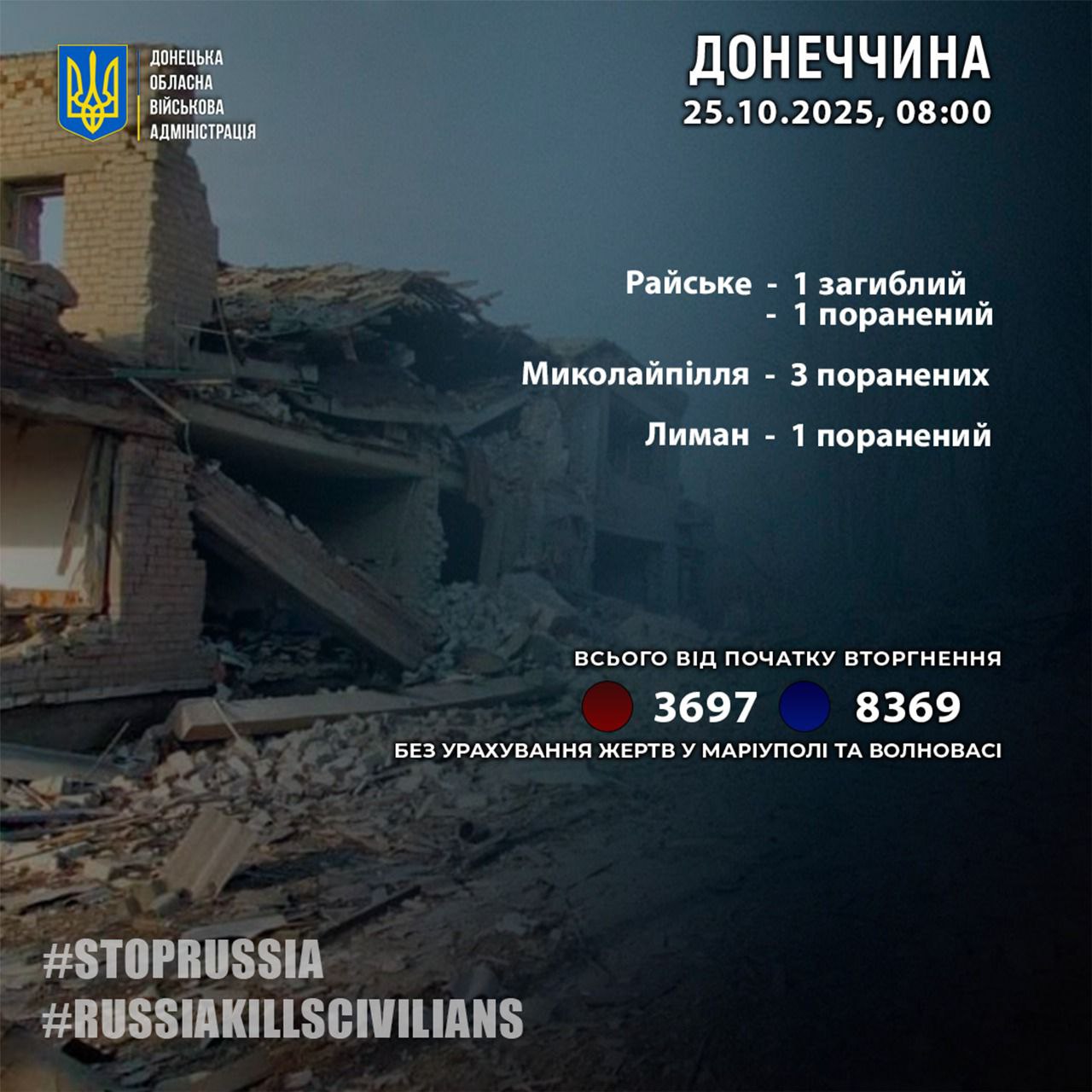 "За 24 октября россияне убили 1 жителя Донетчины: в Райском. Еще 5 человек в области за сутки получили ранения", - сообщил руководитель Донецкой ОВА Вадим Филашкин. Как сообщалось, воины ВСУ рассказали об освобождении большого села на севере Донецкой области.