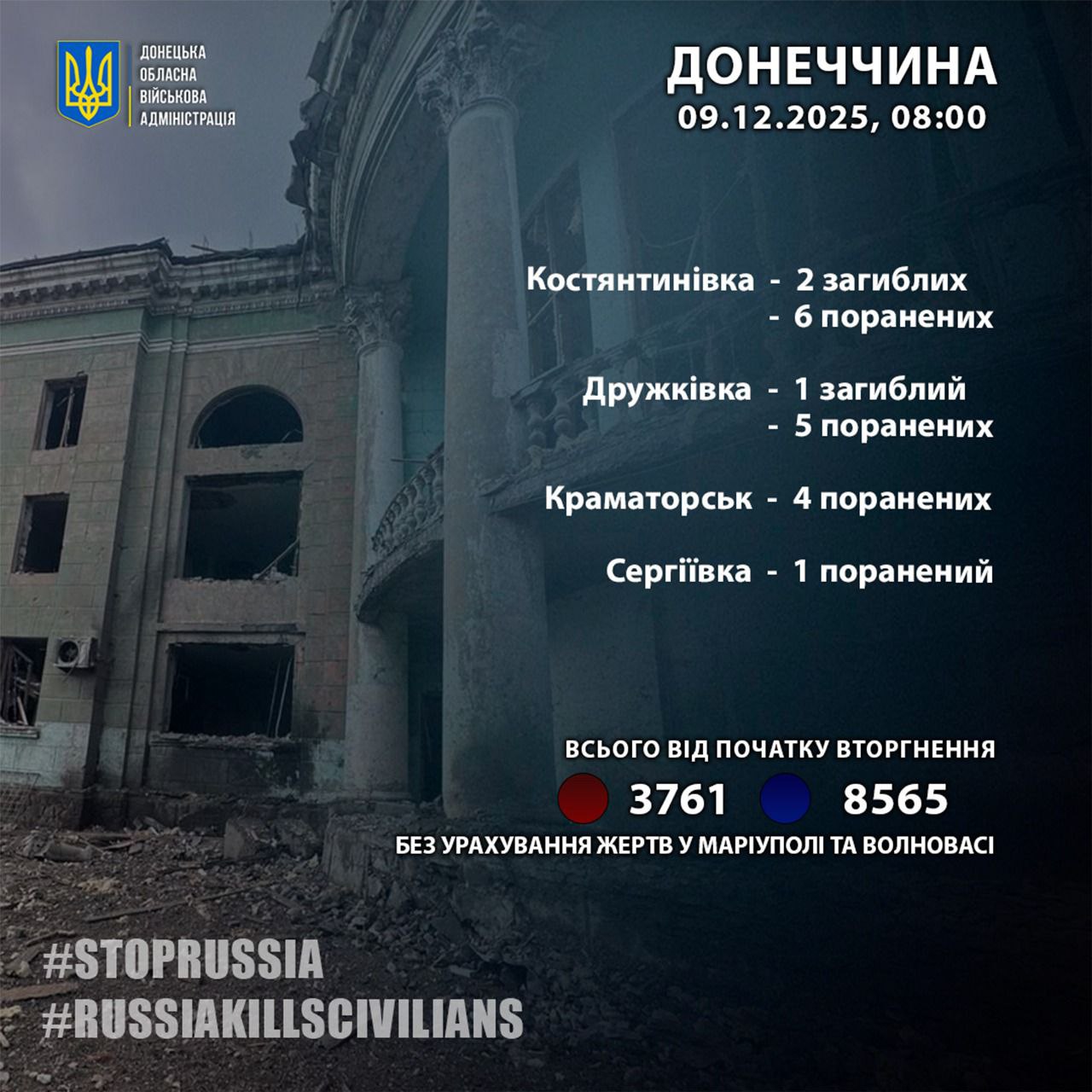 "За 8 декабря россияне убили 3 жителей Донбасса: 2 в Константиновке и 1 в Дружковке", - сообщил руководитель Донецкой области Вадим Филашкин 9 декабря.