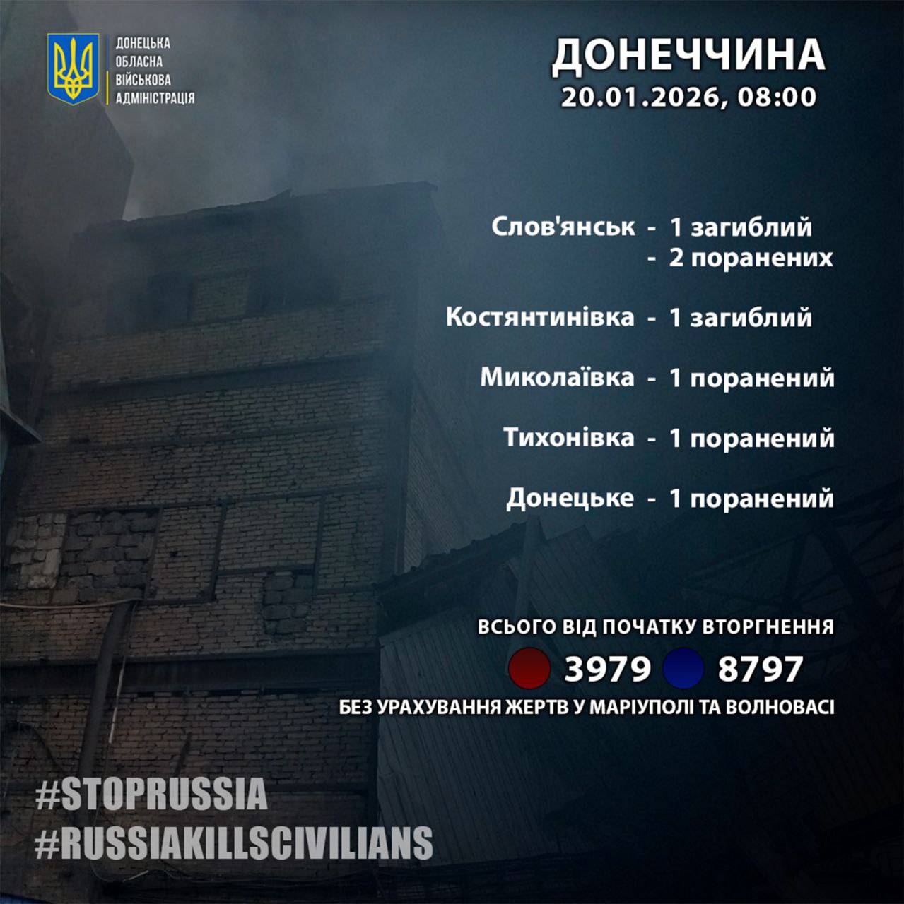 «За 19 января россияне убили 2 жителей Донецкой области: в Славянске и Константиновке», — сообщил руководитель Донецкой ОВА Вадим Филашкин.