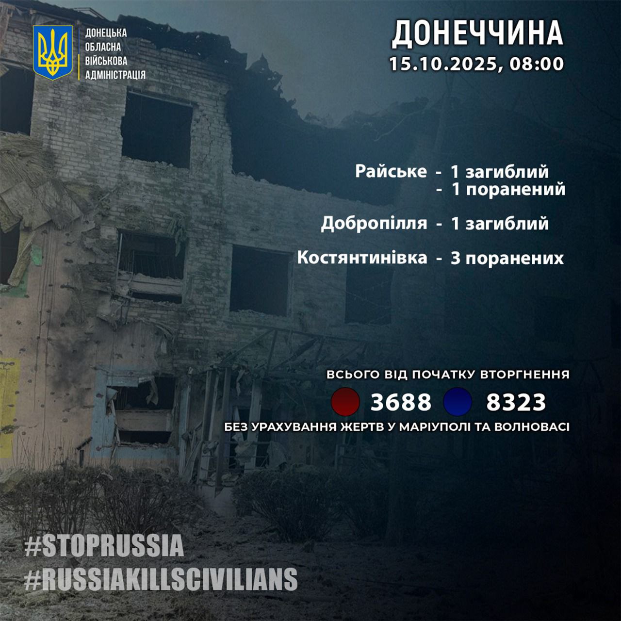 "За 14 октября россияне убили 2 жителей Донетчины: в Доброполье и Райском. Еще 4 человека в области за сутки получили ранения", - сообщил руководитель Донецкой ОВА Вадим Филашкин утром, 15 октября.