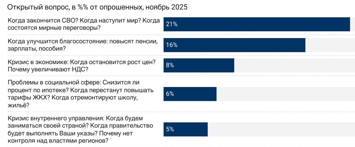 "Главным вопросом, который россияне хотели бы задать на предстоящей «Прямой линии» с Владимиром Путиным, является вопрос о том, когда закончится война с Украиной. Об этом свидетельствуют результаты опроса «Левада-Центра», согласно которым эту тему назвали приоритетной 21% респондентов", - сообщает 17 декабря Телеграм-канал The Moscow Times.