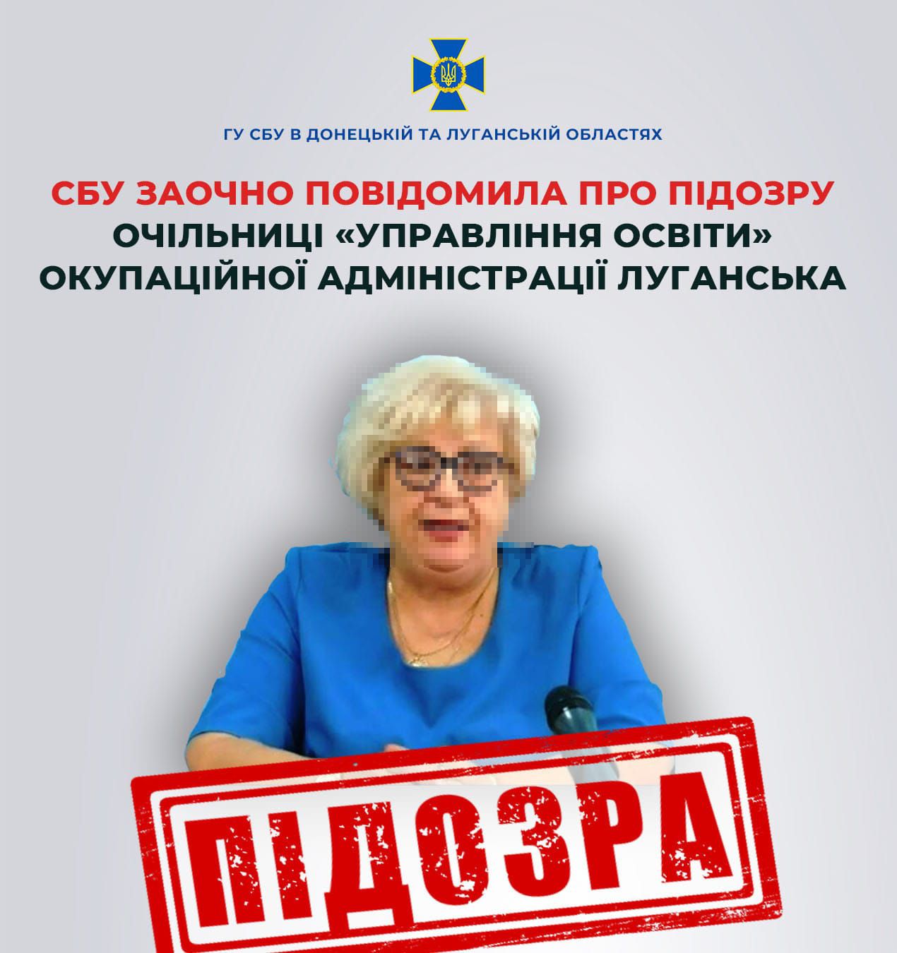 "Служба безопасности Украины задокументировала преступную деятельность коллаборационистки, которая внедряет политику агрессора в сфере образования во временно оккупированном Луганске. ...Оккупационной чиновнице заочно сообщено о подозрении в коллаборационной деятельности по ч. 5 ст. 111-1 Уголовного кодекса Украины, которая предусматривает наказание – до 10 лет лишения свободы с конфискацией имущества. Фигурантка находится в розыске", - сообщило 3-е управления ГУ СБУ в Донецкой и Луганской областях в г. Северскодонецк в facebook 3 февраля.