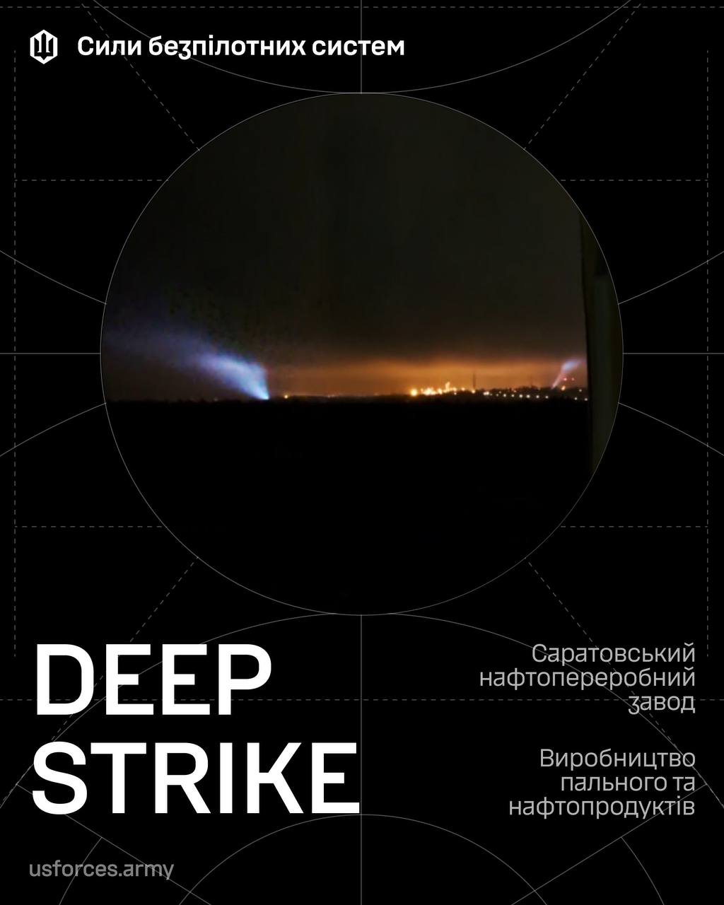 «В ночь на 28 ноября операторы 1-го отдельного центра Сил беспилотных систем (СБС) ВСУ трансформированного 14-го отдельного полка БпАК) поразили Саратовский нефтеперерабатывающий завод», - сообщили в Телеграм-канале СБС 28 ноября.