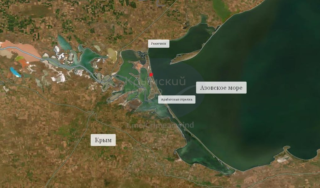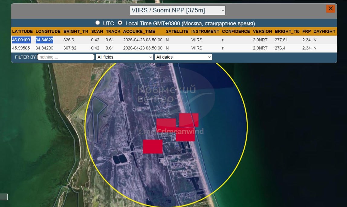 "Пожары на Арабатской стрелке в районе объектов оккупантов фиксируют спутники NASA", - сообщает 23 апреля мониторинговая группа тгк-канала "Крымский ветер".