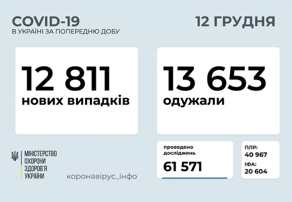 В Украине за минувшие сутки, 11 декабря, зафиксировано еще 12 811 новых случаев коронавирусной болезни COVID-19. Об этом сообщает министр здравоохранения Максим Степанов в Facebook.