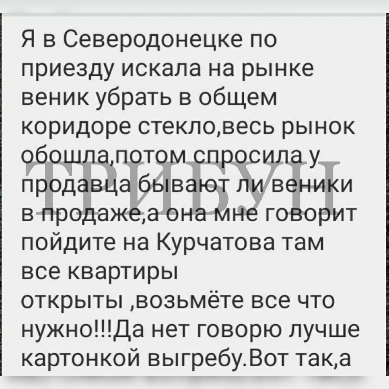 "Я, приехав в Северодонецк, искала на рыке веник, чтобы убрать стекло в общем коридоре, – пишет местная жительница. – Весь рынок обошла, потом спросила у продавщицы, бывают ли веники в продаже. А она мне говорит: "Пойдите на Курчатова, там все квартиры открыты, возьмете все, что нужно". Да нет, говорю, лучше картонкой выгребу".