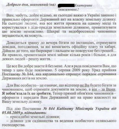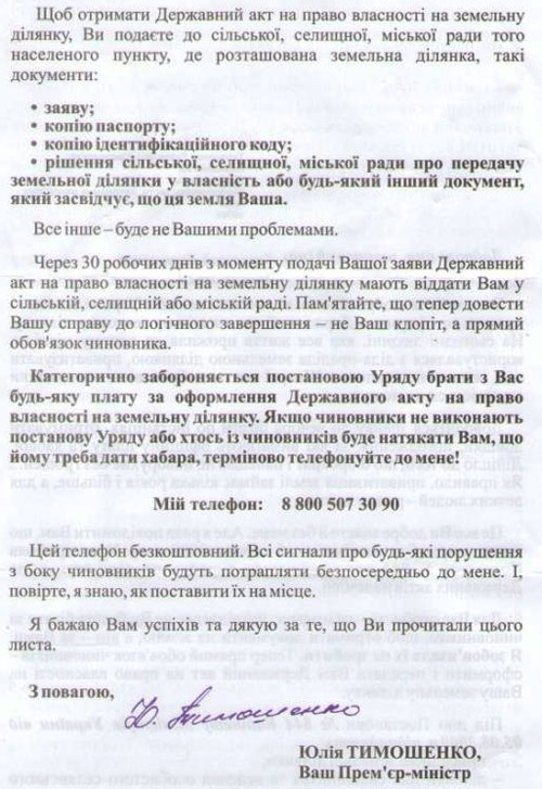 Крестьяне получают письма от имени Премьер-министра Украины Юлии Тимошенко, в которых она рассказывает об упрощенной системе получения земли. Об этом сообщает сайт "Хвилія" публикующий фото письма премьера.