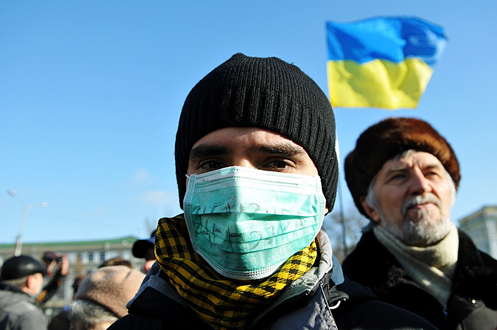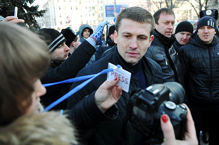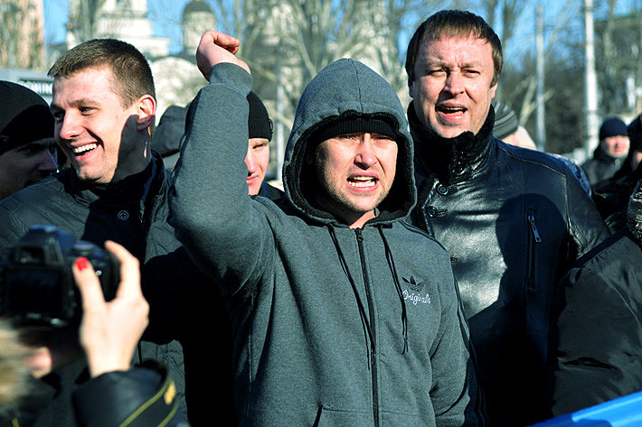 Около 30 неизвестных молодых людей пытались сорвать проведение митинга на Евромайдане в Донецке: громкими криками прерывали выступления спикеров, силой отбирали у людей плакаты с лозунгами. Был порван национальный флаг Украины. Потасовка началась после попытки "евромайдановцев" символически оплатить "работу" титушек горстью мелочи, которую положили в кепку и бросили в толпу противников проведения митинга. Молодые люди с криками "Бей фашистов" вырвали мегафон из рук одного из лидеров донецкой "Свободы" Артура Шевцова и растоптали его. Фото: Михаил Масловский, ОстроВ