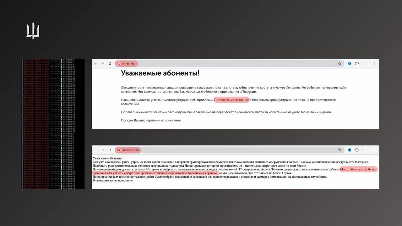 "За прошедшую неделю уничтожено более 100 терабайт данных компании "OrbitSoft" - разработчика программного обеспечения, который выполнял контракты для российской оккупационной армии. Уничтожены все данные на 8 серверах компании "Orient Systems" - разработчика и поставщика оборудования для навигации. Указанная компания сотрудничала с российскими производителями военной техники, в частности, БПЛА. Уничтожены все данные на 19 серверах интернет-провайдеров в городе Нижний Новгород - "Линктелеком НН" и "Аксесс Телеком". Всем абонентам указанных провайдеров поступили письма с напоминанием о неизбежной расплате за войну против Украины", - заявили в ГУР.
