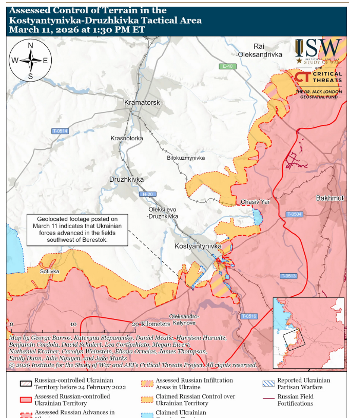 По их информации, российские войска атаковали вблизи самой Константиновки; к юго-востоку от Константиновки вблизи Иванополья и Плещеевки; к югу от Константиновки вблизи Берестока; к юго-западу от Константиновки вблизи Иллиновки и Степановки; к югу от Дружковки вблизи Русин Яра; и к юго-западу от Дружковки вблизи Софиевки и в направлении Новопавловки 10 и 11 марта.