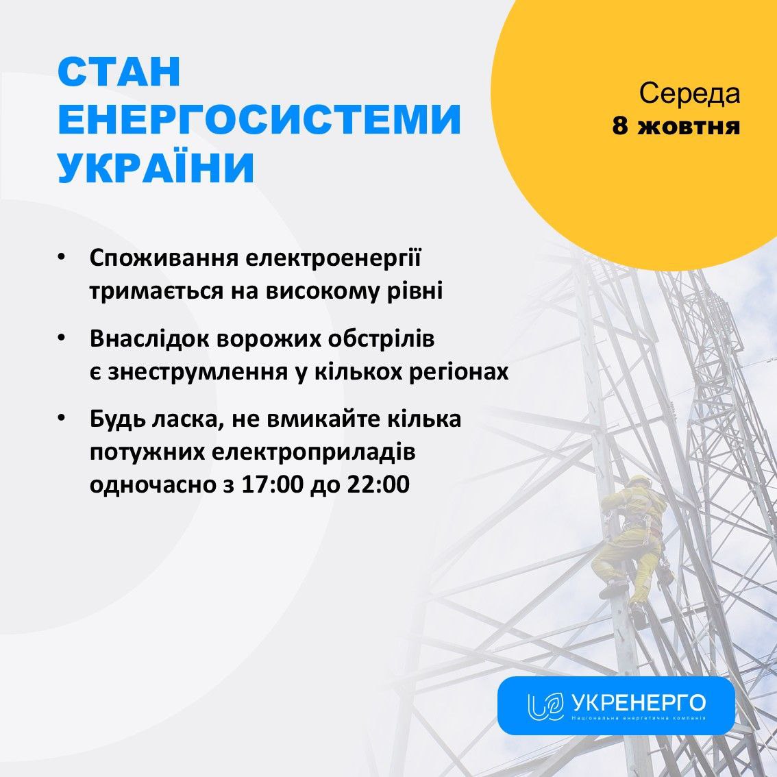"Потребление электроэнергии остается стабильно высоким. Сегодня, 8 октября, по состоянию на 9:30, оно было на том же уровне, что и накануне – во вторник. Причина – сохранение облачной погоды с дождем в большинстве регионов. Это обусловливает низкую эффективность работы бытовых солнечных электростанций и соответствующий рост уровня энергопотребления из общей сети. Вчера, 7 октября, суточный максимум потребления был зафиксирован вечером. Он был таким же, как и максимум предыдущего дня – в понедельник, 6 октября. Необходимость в экономном потреблении электроэнергии сохраняется. Пожалуйста, не включайте несколько мощных приборов одновременно в вечерние часы пиковой нагрузки на энергосистему с 17:00 до 22:00, – призывают энергетики. По информации «Укрэнерго», самой сложной остается ситуация в Черниговской области, где местное облэнерго в настоящее время вынуждено применять почасовые отключения объемом в три очереди одновременно. Аварийно-восстановительные работы продолжаются.
