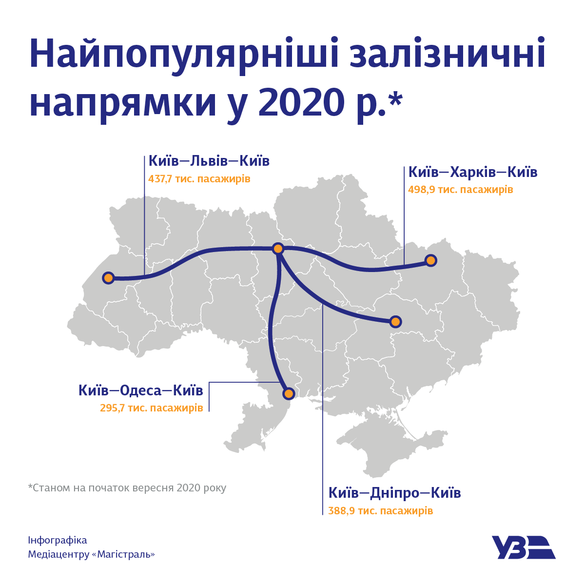 Самыми популярными направлениями поездок оставались сообщения между областными центрами. Так, с начала года сообщением Киев - Харьков - Киев перевезено 498,9 тыс. пассажиров; Киев - Львов - Киев - 437,7 тыс.; Киев - Днепр - Киев - 388,9 тыс.; Киев - Одесса - Киев - 295,7 тыс.