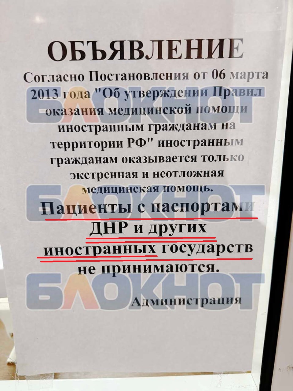 В некоторых донецких поликлиниках висит объявление, что иностранные граждане могут рассчитывать только на экстренную и неотложную медицинскую помощь. При этом к иностранным гражданам отнесены обладатели паспортов так называемой "ДНР"