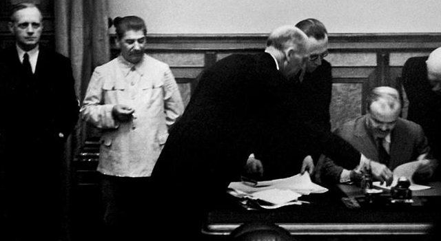 На фото: Иоахим фон Риббентроп, Иосиф Сталин и Вячеслав Молотов. Подписание "пакта Молотова-Риббентропа". Со стороны СССР договор был подписан наркомом по иностранным делам Молотовым, со стороны Германии - ее министром иностранных дел Риббентропом.