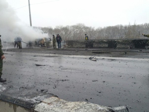 "Сегодня в результате очередного артобстрела, на мост по улице Петровского попал снаряд, образовалась сквозная воронка, размером 1,5 на 1,5 м, погибли водитель автомобиля и, ехавший рядом мужчина на велосипеде. Также, по данным МЧС, в Куйбышевском районе по ул. Ленкоранская, горят балконы в 9-этажном доме. Наряд МЧС выехал на место происшествия, данные о пострадавших уточняются", - сообщает также самопровозглашенная "Донецкая городская администрация "ДНР".