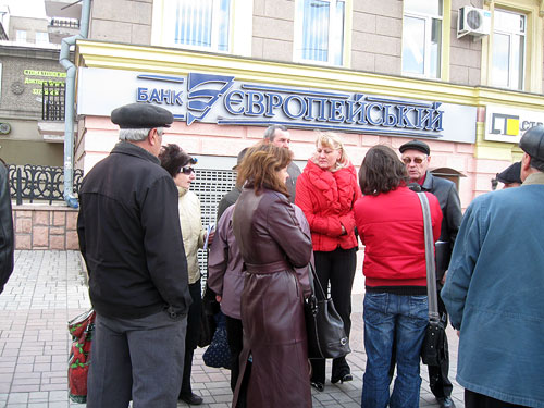 В Донецке у здания банка "Европейский" собрались возмущенные вкладчики, которым не выдают депозиты, хотя срок их истек еще в марте 2009 года.