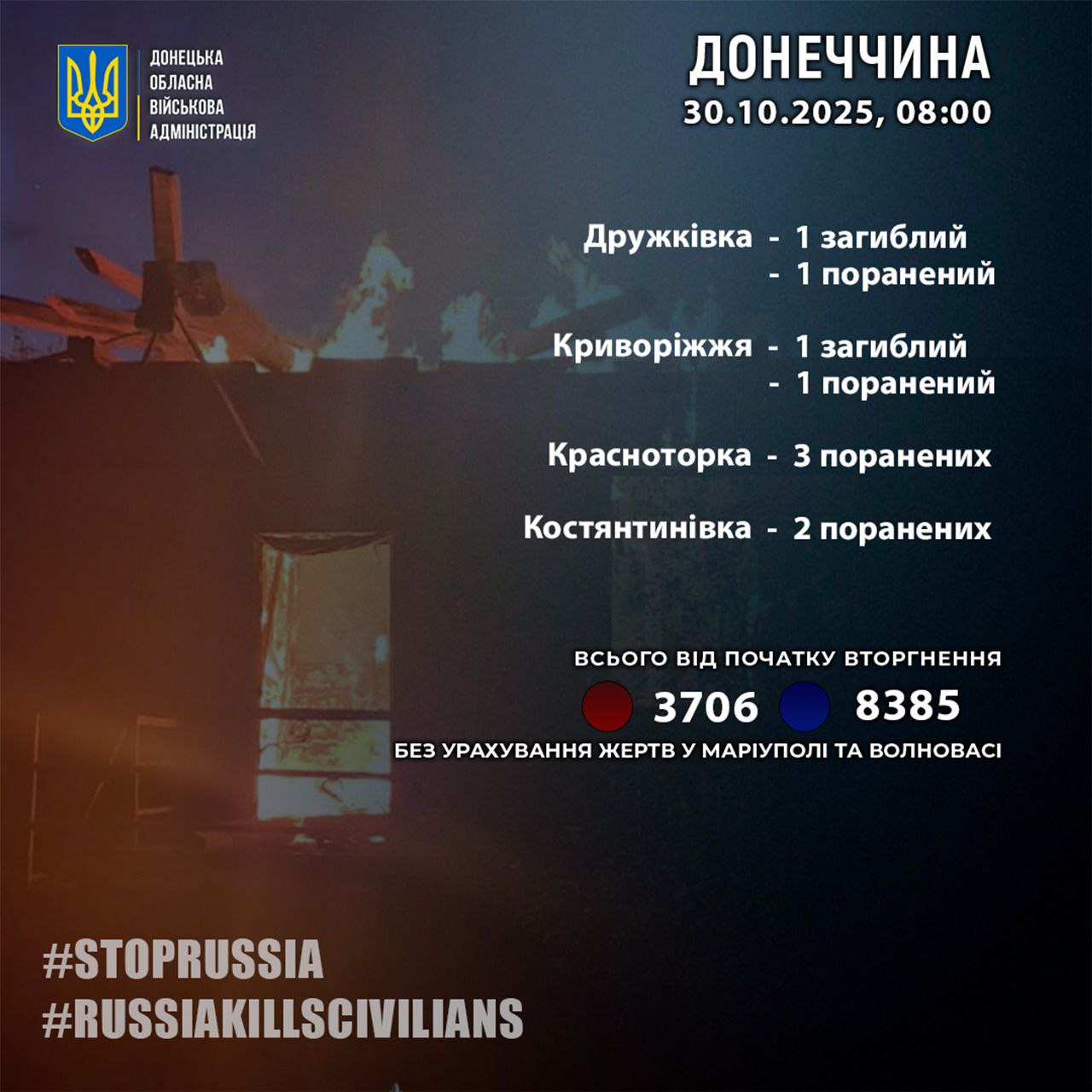 <p style="text-align: justify;">«За 29 октября россияне убили двух жителей Донецкой области: в Дружковке и Криворожье», - <a href="https://t.me/VadymFilashkin/12006" target="_blank" rel="noopener">сообщил</a> глава Донецкой ОВА Вадим Филашкин.</p> <p style="text-align: justify;">По его словам, еще семь человек в области за сутки получили ранения.</p> <div class="article__content__img"><img class="" title="" src="/upload/media/2025/10/30/photo-2025-10-30-07-45-50.jpg" alt="" /></div> <p style="text-align: justify;">Напомним, в Краматорске <a href="/news/u-kramatorsku-cherez-rosijskyj-udar-troye-pensioneriv-otrymaly-minno-vybuhovi-travmy-i537621" target="_blank" rel="noopener">из-за российского удара трое пенсионеров получили минно-взрывные травмы. </a></p>