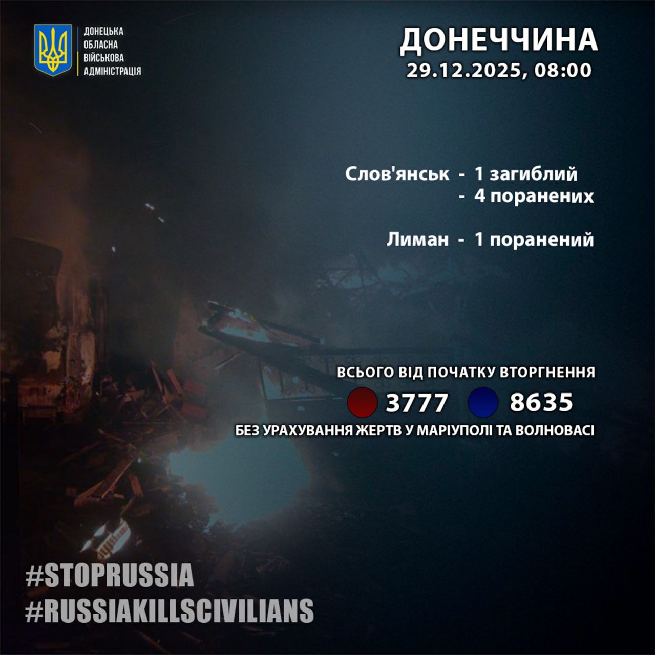 «За 28 декабря россияне убили 1 жителя Донецкой области — в Славянске. Еще 5 человек в области за сутки получили ранения», — сообщил глава Донецкой ОВА Вадим Филашкин.