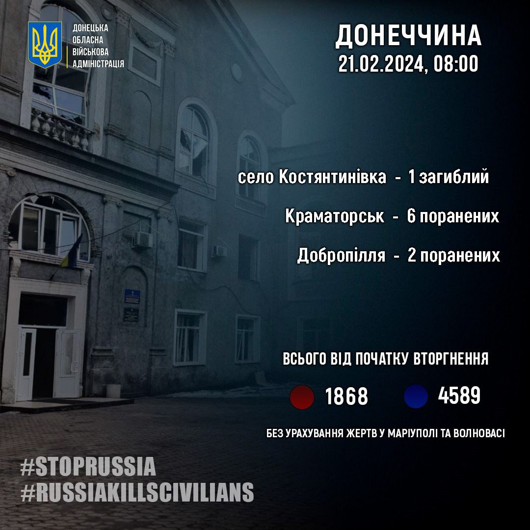 "За 20 февраля россияне убили 1 жителя Донецкой области - в селе Константиновка. Еще 8 человек в области за сутки получили ранения", - сообщил Филашкин.