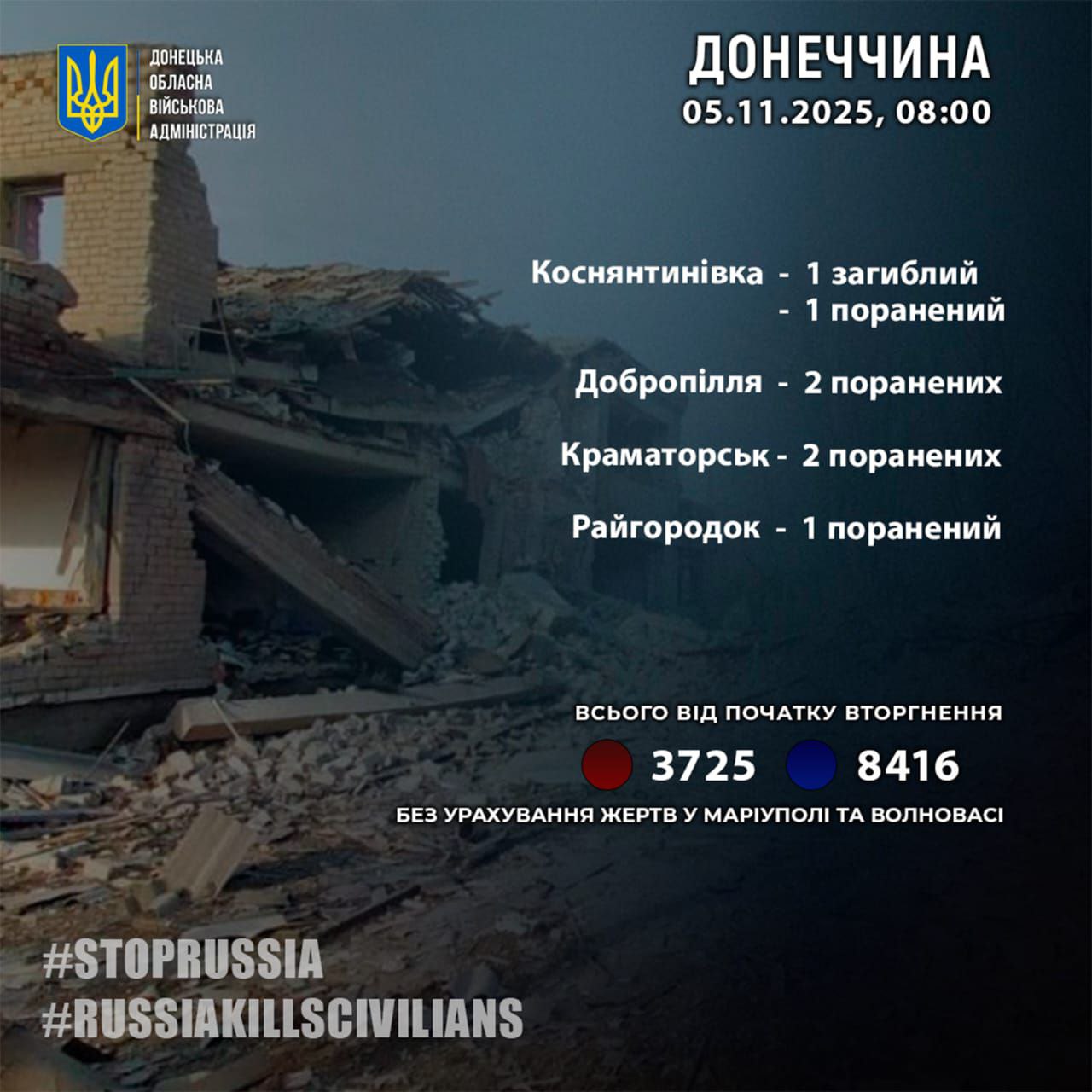 Напомним, 3 ноября два человека погибли, еще два были ранены под российскими ударами в Донецкой области, разрушен 41 жилой дом.