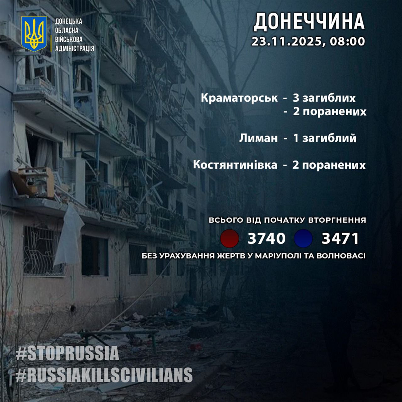 «За 22 ноября россияне убили 4 жителей Донецкой области: 3 в Краматорске и 1 в Лимане», - сообщил глава Донецкой ОВА Вадим Филашкин.