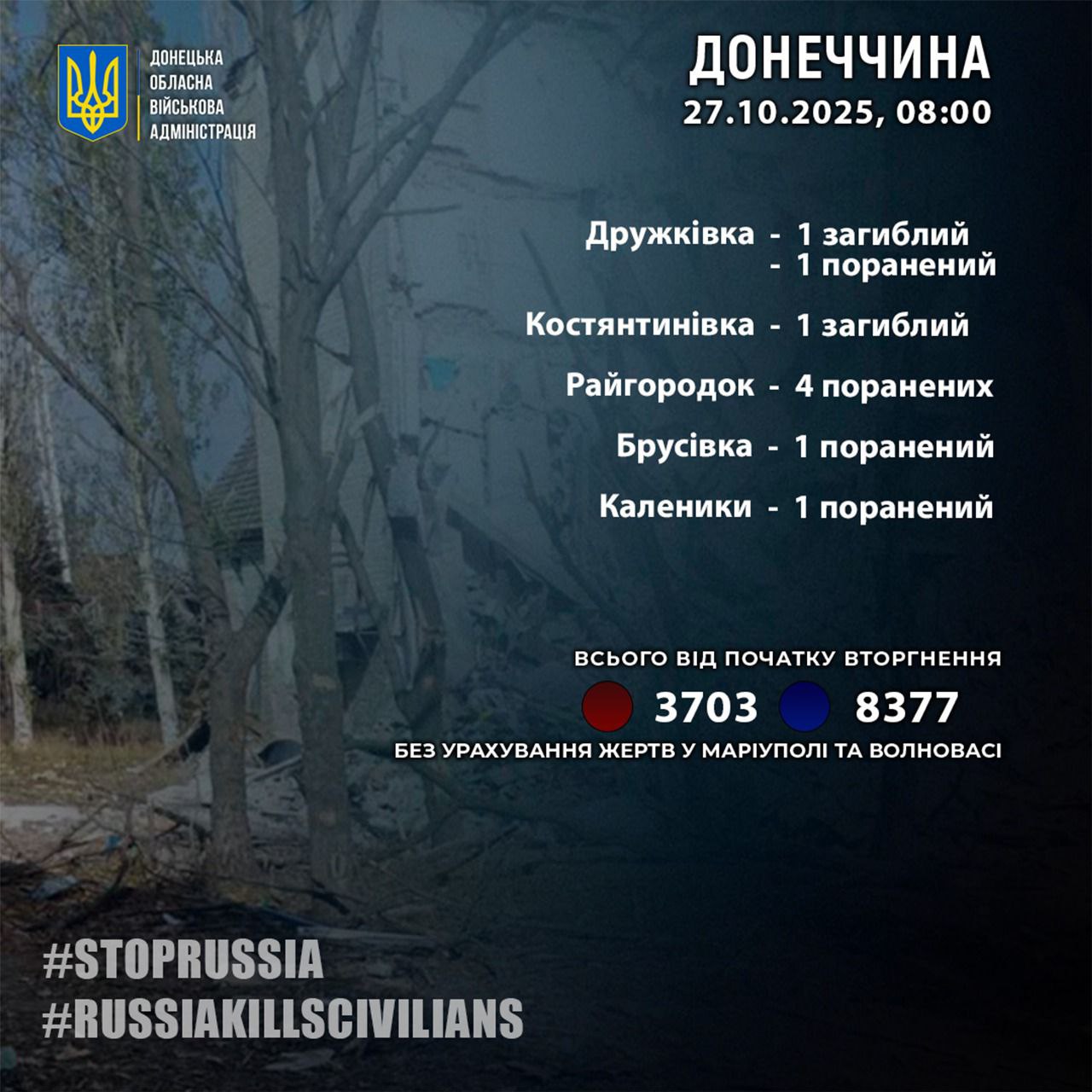 <p style="text-align: justify;">«За 26 октября россияне убили двух жителей Донецкой области: в Константиновке и Дружковке», — <a href="https://t.me/VadymFilashkin/11958" target="_blank" rel="noopener">сообщил</a> глава Донецкой ОВА Вадим Филашкин.</p> <p style="text-align: justify;">По его словам, еще 7 человек в области за сутки получили ранения.</p> <div class="article__content__img"><img class="" title="" src="/upload/media/2025/10/27/photo-2025-10-27-08-04-12.jpg" alt="" /></div> <p style="text-align: justify;">Как сообщалось, в Дружковке <a href="/news/u-druzhkivtsi-rosijskyj-fpv-dron-potsilyv-po-pishohodah-zagynula-zhinka-shhe-odna-distala-poranena-i537339" target="_blank" rel="noopener">российский FPV-дрон попал в пешеходов - погибла женщина, еще одна получила ранения. </a></p>