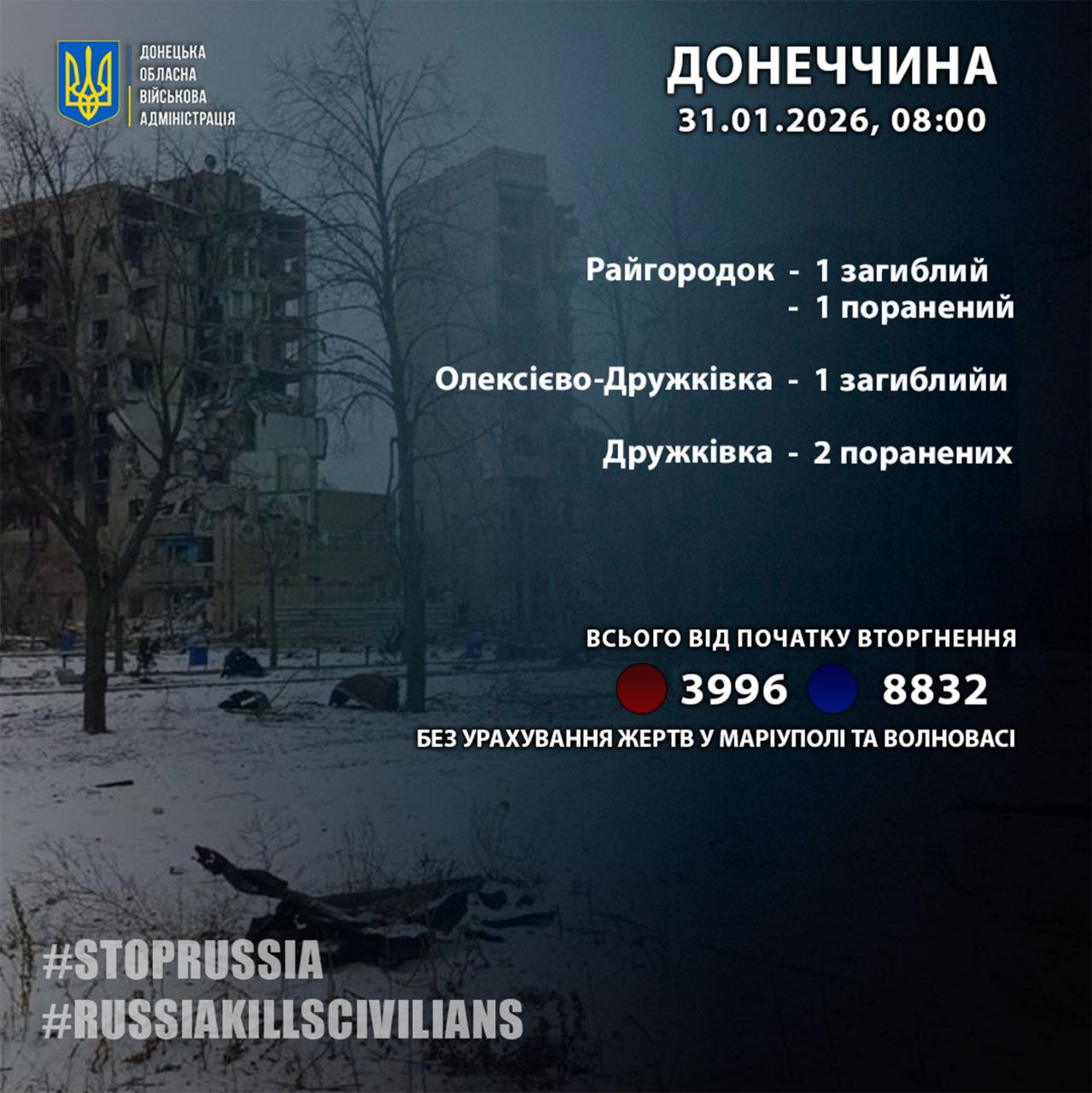 «За 30 января россияне убили 2 жителей Донецкой области: в Райгородке и Алексеево-Дружковке», - сообщил глава Донецкой ОВА Вадим Филашкин.