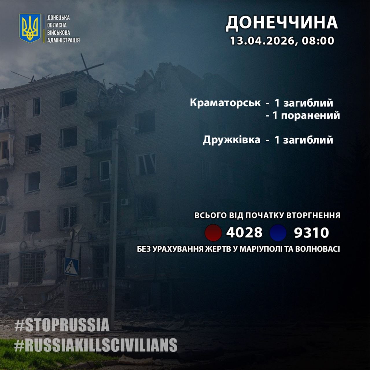 «12 апреля россияне убили двух жителей Донецкой области: в Краматорске и Дружковке», — сообщил глава Донецкой ОВА Ваддим Филашкин.