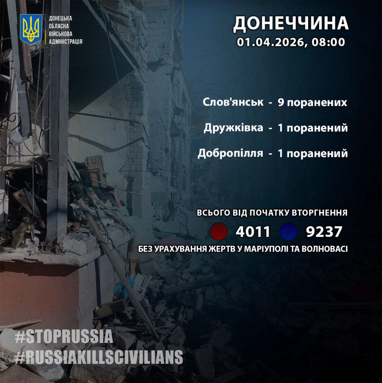 «31 марта россияне ранили 11 жителей Донецкой области», — сообщил глава Донецкой областной государственной администрации Вадим Филашкин.