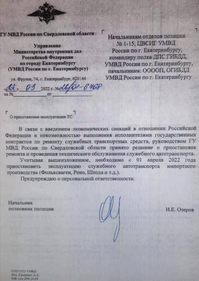 Согласно опубликованной копии распоряжения начальника управления мвд рф по Екатеринбургу полковника Озерова, полиции области запрещено с 1 апреля эксплуатировать "служебный транспорт импортного производства (Фольксваген, Рено, Шкода и т.д.)".