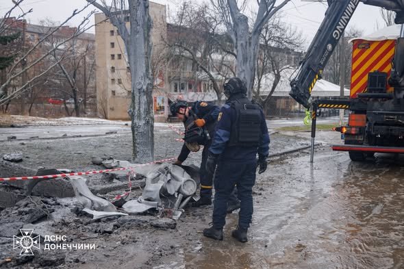"Накануне вражеская авиация нанесла удар по многоквартирной застройке города, попадание пришлось в дорожное покрытие. На месте происшествия пиротехники ГСЧС провели обследование территории и изъяли остатки авиационной бомбы ОДАБ-1500", - сообщает ГСЧС 10 февраля.