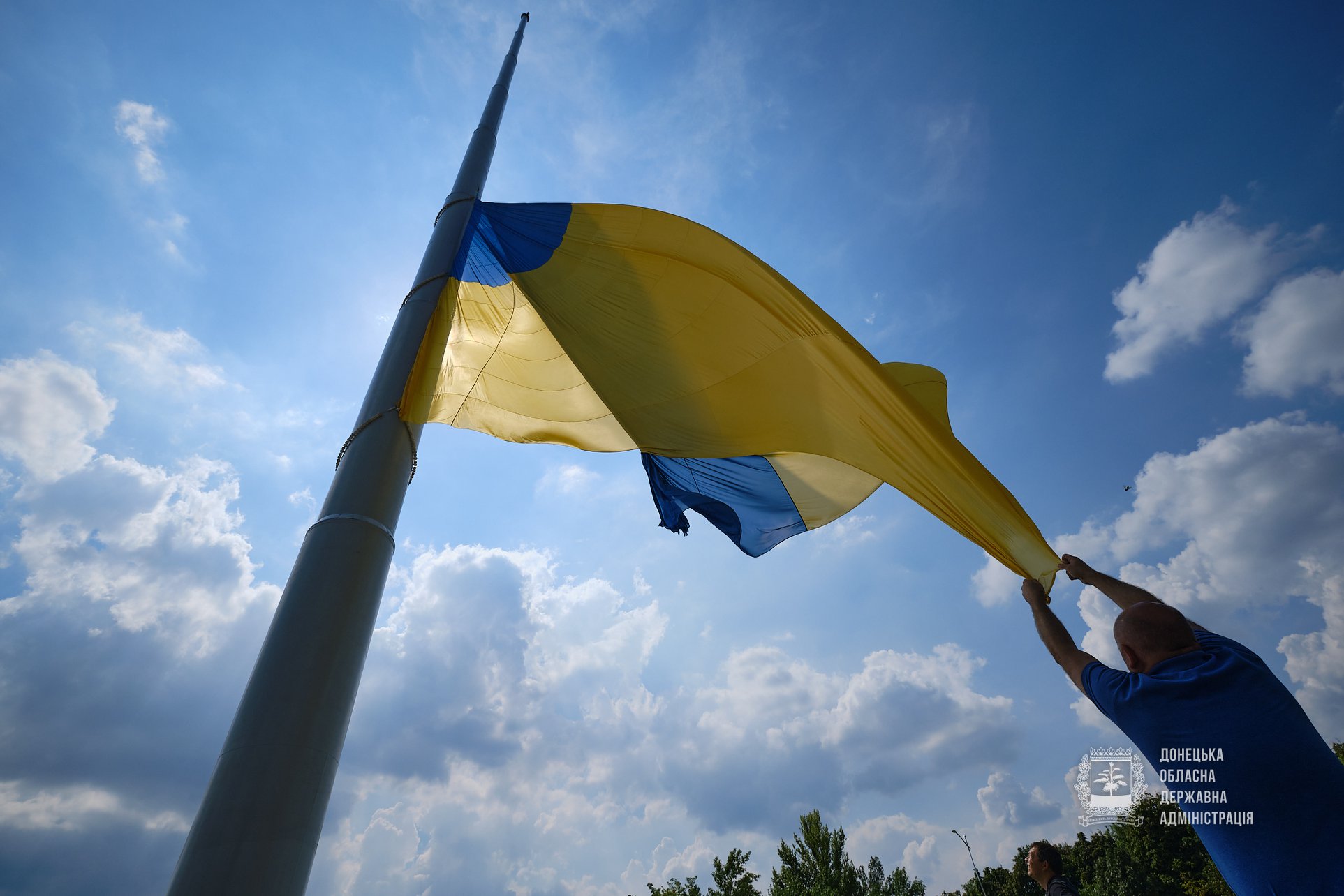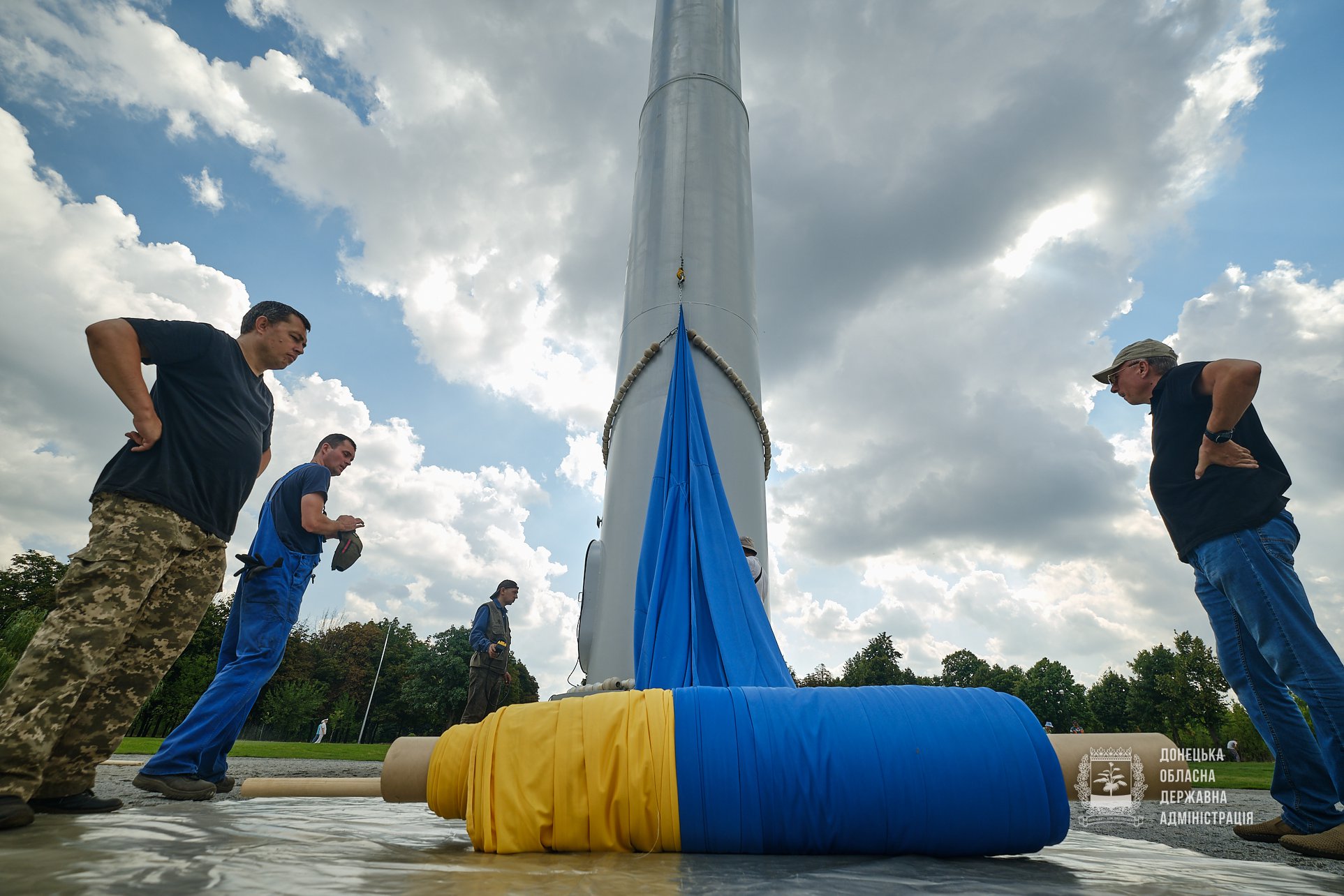 Сегодня в парке «Юбилейный» за неделю до национального праздника – Дня государственного флага, провели в тестовом режиме подъем стяга размером 16 на 24 метра. Он станет самым большим и самым высоким в Донецкой области.