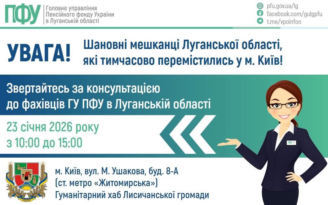 «23 января в гуманитарном центре Лисичанской громады состоится прием внутренне перемещенных лиц представителем ГУ ПФУ в Луганской области», - сообщила Луганская ОВА в соцсетях 21 января.