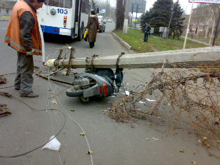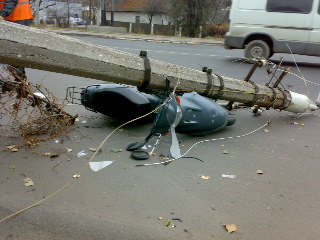 Столб линии электропередачи обрушился на проезжую часть и придавил проезжающего по дороге скутериста в Луганске в воскресенье. Жертв удалось избежать.