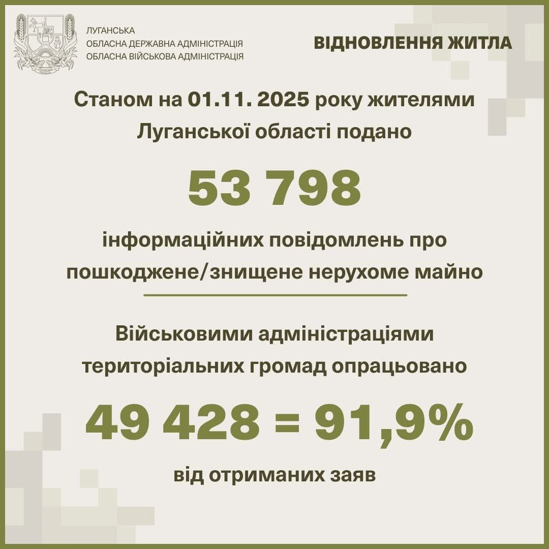 "На данный момент жителями области подано 53 798 информационных сообщений о разрушенном или поврежденном россиянами жилье. В течение октября принято еще 484 заявления", - сообщила Луганская ОВА в соцсетях 5 ноября.
