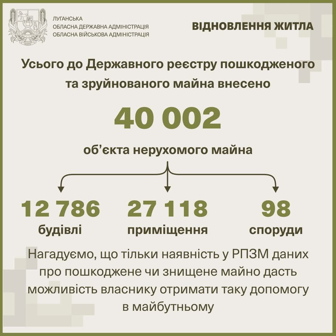 Всего в Реестр поврежденного и уничтоженного имущества (РПУМ) внесено 40 002 объекта недвижимого имущества, в том числе 12 786 зданий, 27 118 помещений и 98 сооружений.