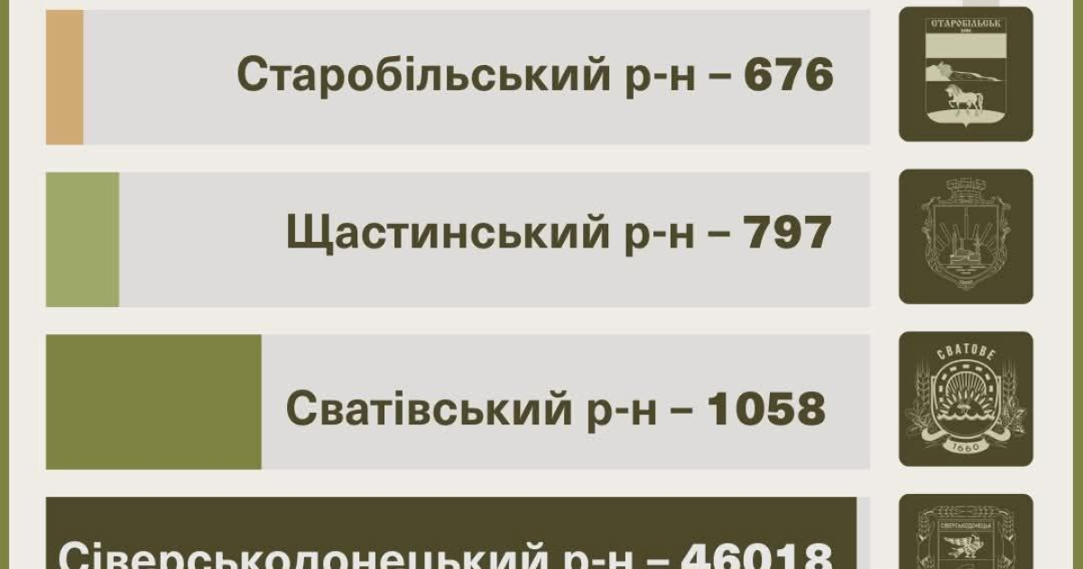 Более 46 тысяч таких сообщений поступили от жителей общин Северскодонецкого района. В Северскодонецкой общине обработано 18 066 сообщений, в Попаснянской – 8 785, в Лисичанской – 7 436, в Рубежанской – 7 196, в Горской – 2 885, в Кременской – 1 650.