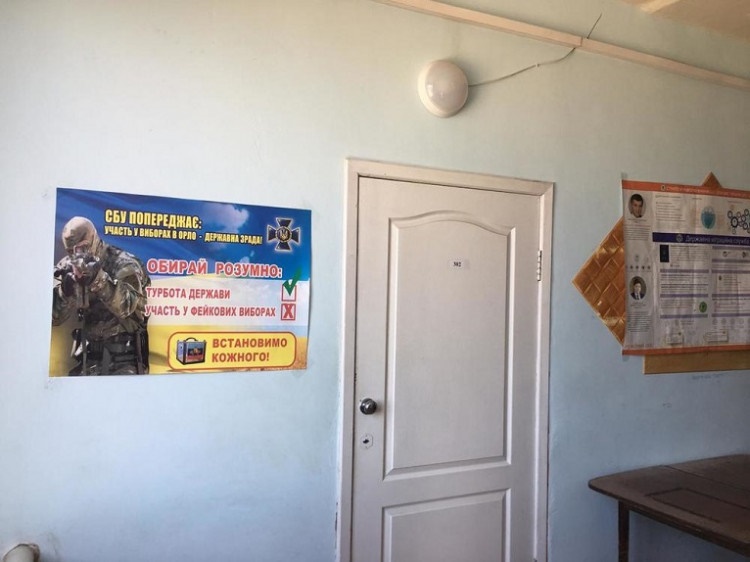 Пользователи обнародовали фото плакатов, размещенных на КПВВ "Станица Луганская". "СБУ попереджає: участь у виборах ОРЛО -державна зрада. Встановимо кожного" - гласят надписи.