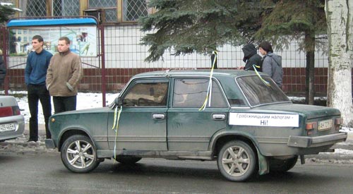 Только что в Мариуполе закончилась акция автомобилистов против введения нового транспортного сбора. Машины самых разных марок с желто-голубыми ленточками на антеннах и надписями «Нет грабительскому транспортному налогу», «Авто – не корова, хватит «доить» и т.п. почти час, не останавливаясь и сигналя кружились по дороге вокруг площади горсовета Мариуполя. Возле площади перед драмтеатром был проведен импровизированный митинг. В акции участвовали примерно 200 машин.