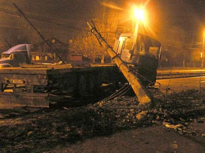 "Аварийные бригады всю ночь работали на месте происшествия. Только к 5 часам утра удалось с помощью крана убрать с проезжей части столб и сдвинуть длинномер", - рассказал начальник городской службы движения Василий Малярчук.